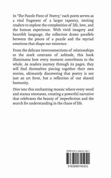 In "The Puzzle Piece of Poetry," each poem serves as a vital fragment of a larger tapestry, inviting readers to explore the complexities of life, love, and the human experience. With vivid imagery and heartfelt language, the collection draws parallels between the pieces of a puzzle and the myriad emotions that shape our existence. From the delicate interconnections of relationships to the stark contrasts of solitude, this book illuminates how every moment contributes to the whole. As readers journey through its pages, they will find themselves piecing together their own stories, ultimately discovering that poetry is not just an art form, but a reflection of our shared humanity. Dive into this enchanting mosaic where every word and stanza resonates, creating a powerful narrative that celebrates the beauty of imperfection and the search for understanding in the chaos of life.