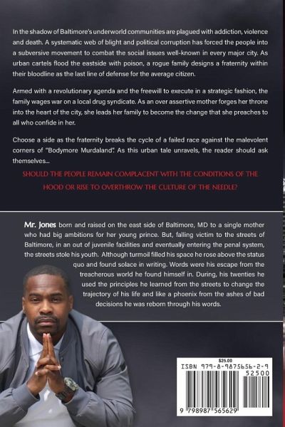 In the shadow of Baltimore's underworld communities are plagued with addiction, violence and death. A systematic web of blight and political corruption has forced the people into a subversive movement to combat the social issues well-known in every major city. As urban cartels flood the eastside with poison, a rogue family designs a fraternity within their bloodline as the last line of defense for the average citizen. Armed with a revolutionary agenda and the freewill to execute in a strategic fashion, the family wages war on a local drug syndicate. As an over assertive mother forges her throne into the heart of the city, she leads her family to become the change that she preaches to all who confide in her. Choose a side as the fraternity breaks the cycle of a failed race against the malevolent corners of "Bodymore Murdaland". As this urban tale unravels, the reader should ask themselves... SHOULD THE PEOPLE REMAIN COMPLACENT WITH THE CONDITIONS OF THE HOOD OR RISE TO OVERTHROW THE CULTURE OF THE NEEDLE?