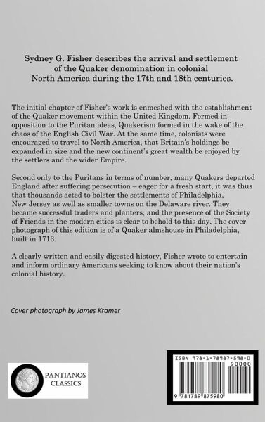 Sydney G. Fisher describes the arrival and settlement of the Quaker denomination in colonial North America during the 17th and 18th centuries. The initial chapter of Fisher's work is enmeshed with the establishment of the Quaker movement within the United Kingdom. Formed in opposition to the Puritan ideas, Quakerism formed in the wake of the chaos of the English Civil War. At the same time, colonists were encouraged to travel to North America, that Britain's holdings be expanded in size and the new continent's great wealth be enjoyed by the settlers and the wider Empire. Second only to the Puritans in terms of number, many Quakers departed England after suffering persecution - eager for a fresh start, it was thus that thousands acted to bolster the settlements of Philadelphia, New Jersey as well as smaller towns on the Delaware river. They became successful traders and planters, and the presence of the Society of Friends in the modern cities is clear to behold to this day. The cover photograph of this edition is of a Quaker almshouse in Philadelphia, built in 1713. A clearly written and easily digested history, Fisher wrote to entertain and inform ordinary Americans seeking to know about their nation's colonial history.