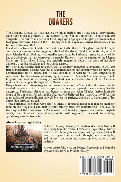 If you want to discover the captivating history of the Quakers, then keep reading... Many other mainline Christians viewed the Quakers as a dangerous sect, so much so that they pressured the British Parliament to pass the Quaker Act of 1662. This act set forth in law the "prescribed form" of prayer and worship as designated by the state. It was a formula that specifically left the traditions of the Quakers out. Unable to gain acceptance in England, the Quakers would soon leave the place of their origin altogether and try their luck in a brave new world on another continent. In The Quakers: A Captivating Guide to a Historically Christian Group and How William Penn Founded the Colony of Pennsylvania in British North America, you will discover topics such asThe Quakers Arrive in America William Penn Comes to the Quaker Faith William Penn's Holy Experiment William Penn, Pennsylvania, and Its Quaker Legacy The State of Quakerism after William Penn Quaker Life during the American Revolution A Time of Great Adjustment The Quakers the Civil War and Its Aftermath Some Modern-Day Quaking in the Making And much, much more! So if you want to learn more about the Quakers, scroll up and click the "add to cart" button!