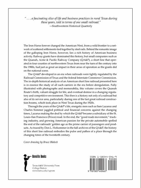 The Iron Horse forever changed the American West, from a wild frontier to a network of scattered settlements tied together by steel rails. Behind the romantic image of the galloping Iron Horse, however, lies a rich history of American business activity. Railway giants have dominated this history, but small companies such as the Quanah, Acme & Pacific Railway Company (QA&P), a short line that operated in four counties of northwestern Texas from near the turn of the century into the 1980s, had just as great an impact in their areas of operation as the giants did on the national scene. The QA&P developed in an era when railroads were tightly regulated by the Railroad Commission of Texas and the federal Interstate Commerce Commission. The in-depth historical analysis of an American short line railroad presented here is in essence the study of all such carriers in the era before deregulation. Fully illustrated with photographs and memorabilia, this volume covers the Quanah Route's birth, valiant struggle for life, and eventual demise in a changing regulatory and competitive environment. This then is a history not only of a railroad but also of its service area, particularly during one of the last great railroad construction booms, which took place in West Texas during the 1920s. Through the years of the QA&P's life, energetic men such as Sam Lazarus and Charles Sommer juggled political and financial concerns against the changing times, Lazarus making the deal by which the QA&P became a subsidiary of the St. Louis-San Francisco (Frisco) road. In the end, the "good roads movement," trucking industry, and growing American passion for the private automobile spelled the end of the railroads' golden age as the prime carrier of passengers and products. As traced by Don L. Hofsommer in the full archives of the QA&P, the history of this short line railroad embodies the pulse and pathos of a place through the changing times of the twentieth century.