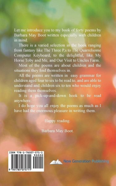 Let me introduce you to my book of forty poems by Barbara May Boot written especially with children in mind. There is a varied selection in the book ranging from fantasy like The Three P,s to The Quarrelsome Computer Keyboard, to the delightful, like My Horse Toby and Me, and Our Visit to Uncles Farm. Most of the poems are about children and the situations they find themselves in. All the poems are written in easy grammar for children aged four to six to be read to, and are able to understand and children six to ten who would enjoy reading them themselves. It is a pick-up-and-down book to be read anywhere. I do hope you all enjoy the poems as much as I have had the enormous pleasure in writing them. Happy reading. Barbara May Boot.