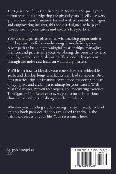 The Quarter-Life Reset: Thriving in Your 20s and 30s is your ultimate guide to navigating the pivotal years of self-discovery, growth, and transformation. Packed with actionable strategies and empowering insights, this book is designed to help you take control of your future and create a life you love. Your 20s and 30s are often filled with exciting opportunities, but they can also feel overwhelming. From defining your career path to building meaningful relationships, managing finances, and prioritizing your well-being, the pressure to have it all figured out can be daunting. This book helps you cut through the noise and focus on what truly matters. You'll learn how to identify your core values, set achievable goals, and develop long-term habits that lead to success. Dive into practical tips for financial confidence, mastering the art of saying no, and crafting a roadmap for your future. With relatable stories, proven techniques, and motivating exercises, The Quarter-Life Reset empowers you to make intentional choices and embrace challenges with confidence. Whether you're feeling stuck, seeking clarity, or ready to level up, this book provides the tools you need to thrive in the defining decades of your life. Your reset starts here.