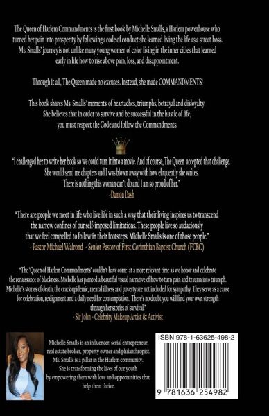 The Queen of Harlem Commandments is the first book by Michelle Smalls, a Harlem powerhouse who turned her pain into prosperity by following a code of conduct she first learned living the life of a street boss. Ms. Smalls's journey is not unlike many young women of color living in the inner cities that learn early in life how to rise above pain, loss, and disappointment. Through it all, the Queen made no excuses. Instead, she made commandments.This book shares Ms. Smalls' moments of heartache. triumphs, betrayal, and disloyalty She believes in order to survive and be successful in the hustle of life, you must respect the Code and follow the Commandments.