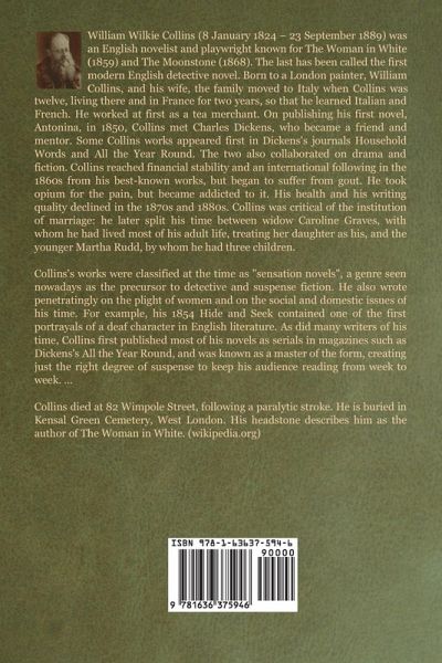 Interesting collection of 10 short stories, plus an extra one, equally interesting, that makes the frame of the other ten. The best stories, in my opinion, are the frequently antologized "The biter bit," plus "A plot in private life" and the frame story ("The Queen of Hearts"). (Manuel Alfonseca) BIO William Wilkie Collins (8 January 1824 - 23 September 1889) was an English novelist and playwright known for The Woman in White (1859) and The Moonstone (1868). The last has been called the first modern English detective novel. Born to a London painter, William Collins, and his wife, the family moved to Italy when Collins was twelve, living there and in France for two years, so that he learned Italian and French. He worked at first as a tea merchant. On publishing his first novel, Antonina, in 1850, Collins met Charles Dickens, who became a friend and mentor. Some Collins works appeared first in Dickens's journals Household Words and All the Year Round. The two also collaborated on drama and fiction. Collins reached financial stability and an international following in the 1860s from his best-known works, but began to suffer from gout. He took opium for the pain, but became addicted to it. His health and his writing quality declined in the 1870s and 1880s. Collins was critical of the institution of marriage: he later split his time between widow Caroline Graves, with whom he had lived most of his adult life, treating her daughter as his, and the younger Martha Rudd, by whom he had three children. Collins's works were classified at the time as "sensation novels", a genre seen nowadays as the precursor to detective and suspense fiction. He also wrote penetratingly on the plight of women and on the social and domestic issues of his time. For example, his 1854 Hide and Seek contained one of the first portrayals of a deaf character in English literature. As did many writers of his time, Collins first published most of his novels as serials in magazines such as Dickens's All the Year Round, and was known as a master of the form, creating just the right degree of suspense to keep his audience reading from week to week. ... Collins died at 82 Wimpole Street, following a paralytic stroke. He is buried in Kensal Green Cemetery, West London. His headstone describes him as the author of The Woman in White. (wikipedia.org)