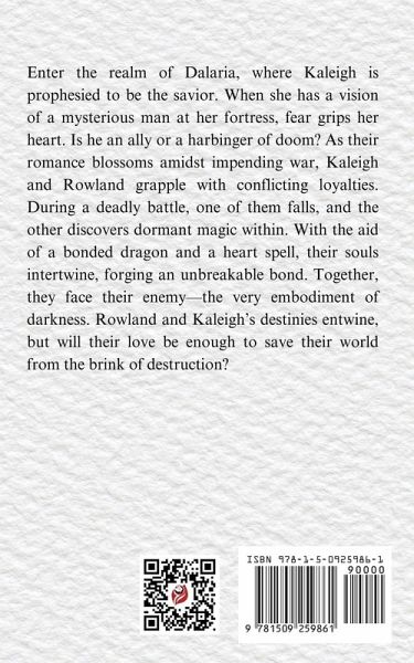 Enter the realm of Dalaria, where Kaleigh is prophesied to be the savior. When she has a vision of a mysterious man at her fortress, fear grips her heart. Is he an ally or a harbinger of doom? As their romance blossoms amidst impending war, Kaleigh and Rowland grapple with conflicting loyalties. During a deadly battle, one of them falls, and the other discovers dormant magic within. With the aid of a bonded dragon and a heart spell, their souls intertwine, forging an unbreakable bond. Together, they face their enemy-the very embodiment of darkness. Rowland and Kaleigh's destinies entwine, but will their love be enough to save their world from the brink of destruction?