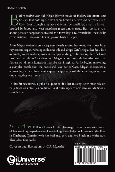 Before twelve-year-old Megan Blayne moves to Hollow Mountain, she believes that nothing can ever come between herself and her twin sister, Cate. Even though they have different personalities, they are forever bonded by blood and wear matching green amber rings. But just as myths about peculiar happenings around the town begin to overwhelm their daily conversations, Cate?and her ring?suddenly disappear. After Megan embarks on a desperate search to find her twin, she is met by a mysterious serpent who opens his mouth and drops Cate?s ring at her feet. But as quickly as the snake appears, it disappears, along with the ring. Terrified and more worried about Cate than ever, Megan sets out on a daring adventure in a fantasy world more dangerous than she ever imagined. As she begins unraveling a complex puzzle that she hopes will lead her to Cate, Megan encounters a strange boy, an evil lord, and serpent people who will do anything to get the one thing they want most. In this fantasy novel, a girl on a quest to find her missing sister must rely on help from an unlikely new friend as she attempts to save two worlds from a terrible fate.