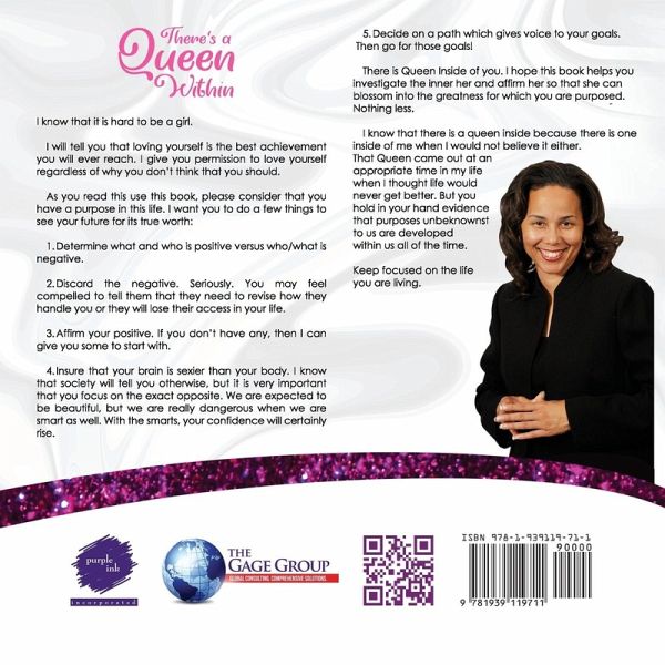There’s A Queen Within I know that it is hard to be a girl. I will tell you that loving yourself is the best achievement you will ever reach. I give you permission to love yourself—regardless of why you don’t think that you should. As you read this use this book, please consider that you have a purpose in this life. I want you to do a few things to see your future for its true worth: Determine what and who is positive versus who/what is negative. Discard the negative. Seriously. You may feel compelled to tell them that they need to revise how they handle you or they will lose their access in your life. Affirm your positive. If you don’t have any, then I can give you some to start with. Insure that your brain is sexier than your body. I know that society will tell you otherwise, but it is very important that you focus on the exact opposite. We are expected to be beautiful, but we are really dangerous when we are smart as well. With the smarts, your confidence will certainly rise. Decide on a path which gives voice to your goals. Then go for those goals! There is Queen Inside of you. I hope this book helps you investigate the inner her and affirm her so that she can blossom into the greatness for which you are purposed. Nothing less. I know that there is a queen inside because there is one inside of me when I would not believe it either. That Queen came out at an appropriate time in my life when I thought life would never get better. But you hold in your hand evidence that purposes unbeknownst to us are developed within us all of the time. Keep focused on the life you are living.