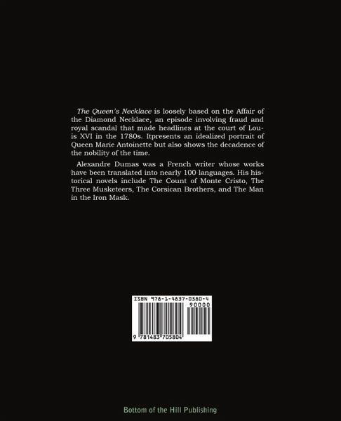 The Queen's Necklace is loosely based on the Affair of the Diamond Necklace, an episode involving fraud and royal scandal that made headlines at the court of Louis XVI in the 1780s. Itpresents an idealized portrait of Queen Marie Antoinette but also shows the decadence of the nobility of the time. Alexandre Dumas was a French writer whose works have been translated into nearly 100 languages. His historical novels include The Count of Monte Cristo, The Three Musketeers, The Corsican Brothers, and The Man in the Iron Mask.