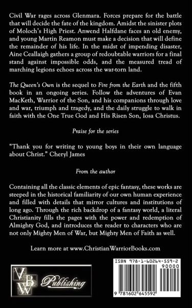 Civil War rages across Glenmara. Forces prepare for the battle that will decide the fate of the kingdom. Amidst the sinister plots of Moloch's High Priest. Anwend Halfdane faces an old enemy, and young Martin Reamon must make a decision that will define the remainder of his life. In the midst of impending disaster, Aine Ceallaigh gathers a group of redoubtable warriors for a final stand against impossible odds, and the measured tread of marching legions echoes across the war-torn land. "The Queen's Own" is the sequel to "Fire from the Earth" and the fifth book in an ongoing series. Follow the adventures of Evan MacKeth, Warrior of the Son, and his companions through love and war, triumph and tragedy, and the daily struggle to walk in faith with the One True God and His Risen Son, Iosa Christus.
