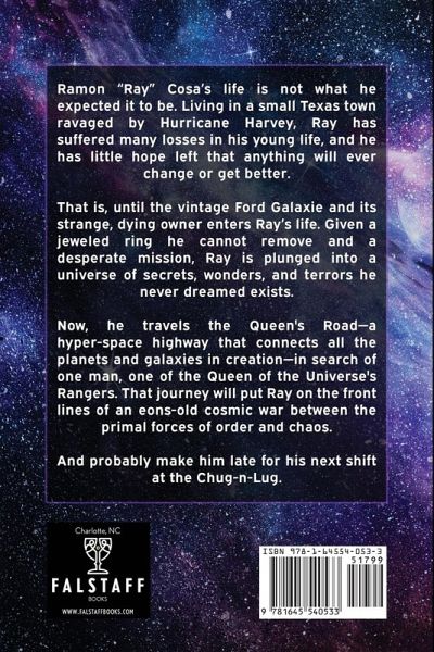 Ramon "Ray" Cosa's life is not what he expected it to be. Living in a small Texas town ravaged by Hurricane Harvey, Ray has suffered many losses in his young life, and he has little hope left that anything will ever change or get better. That is, until the vintage Ford Galaxie and its strange, dying owner enters Ray's life. Given a jeweled ring he cannot remove and a desperate mission, Ray is plunged into a universe of secrets, wonders, and terrors he never dreamed exists. Now, he travels the Queen's Road - a hyper-space highway that connects all the planets and galaxies in creation - in search of one man, one of the Queen of the Universe's Rangers. That journey will put Ray on the front lines of an eons-old cosmic war between the primal forces of order and chaos. And probably make him late for his next shift at the Chug-n-Lug.