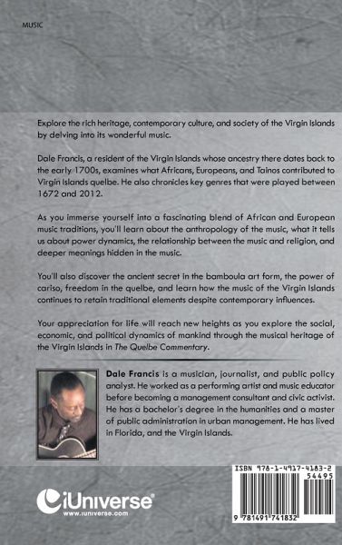 Explore the rich heritage, contemporary culture, and society of the Virgin Islands by delving into its wonderful music. Dale Francis, a resident of the Virgin Islands whose ancestry there dates back to the early 1700s, examines what Africans, Europeans, and Tainos contributed to Virgin Islands quelbe. He also chronicles key genres that were played between 1672 and 2012. As you immerse yourself into a fascinating blend of African and European music traditions, you?ll learn about the anthropology of the music, what it tells us about power dynamics, the relationship between the music and religion, and deeper meanings hidden in the music. You?ll also discover the ancient secret in the bamboula art form, the power of cariso, freedom in the quelbe, and learn how the music of the Virgin Islands continues to retain traditional elements despite contemporary influences. Your appreciation for life will reach new heights as you explore the social, economic, and political dynamics of mankind through the musical heritage of the Virgin Islands in The Quelbe Commentary.