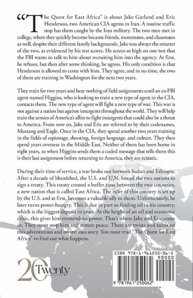 "The Quest for East Africa" is about Jake Garland and Eric Henderson, two American CIA agents in Iran. A routine traffic stop has them caught by the Iran military. The two men met in college, where they quickly become became friends, roommates, and classmates as well, despite their different family backgrounds. Jake was always the smarter of the two, as evidenced by his test scores. He scores so high on one test that the FBI wants to talk to him about recruiting him into the agency. At first, he refuses, but then after some thinking, he agrees. His only condition is that Henderson is allowed to come with him. They agree, and in no time, the two of them are training in Washington for the next two years. They train for two years and hear nothing of field assignments until an ex-FBI agent named Higgins, who is looking to train a new type of agent in the CIA, contacts them. The new type of agent will fight a new type of war. This war is not against a nation but against insurgents throughout the world. They will help train the armies of America's allies to fight insurgents that could also be a threat to America. From now on, Jake and Eric are referred to by their codenames, Mustang and Eagle. Once in the CIA, they spend another two years training in the fields of espionage, shooting, foreign language, and culture. They then spend years overseas in the Middle East. Neither of them has been home in eight years, so when Higgins sends them a coded message that tells them this is their last assignment before returning to America, they are ecstatic. During their time of service, a war broke out between Sudan and Ethiopia. After a decade of bloodshed, the U.S. and U.N. forced the two nations to sign a treaty. This treaty created a buffer zone between the two countries, a new nation that is called East Africa. The ruler of this country is set up by the U.S. and at first, becomes a valuable ally to them. Unfortunately, he later turns power-hungry. This is due in part to finding oil in his country, which is the biggest deposit in years. At the height of an oil and economic crisis, this gives him tremendous power. That's where Jake and Eric come in. They must stop him and restore peace. There are twists and turns on this adventurous and mysterious story. You must read "The Quest for East Africa" to find out what happens.