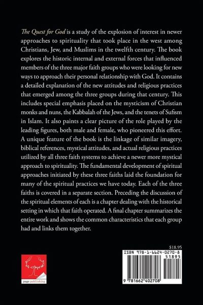 The Quest for God is a study of the explosion of interest in newer approaches to spirituality that took place in the west among Christians, Jew, and Muslims in the twelfth century. The book explores the historic internal and external forces that influenced members of the three major faith groups who were looking for new ways to approach their personal relationship with God. It contains a detailed explanation of the new attitudes and religious practices that emerged among the three groups during that century. This includes special emphasis placed on the mysticism of Christian monks and nuns, the Kabbalah of the Jews, and the tenets of Sufism in Islam. It also paints a clear picture of the role played by the leading figures, both male and female, who pioneered this effort. A unique feature of the book is the linkage of similar imagery, biblical references, mystical attitudes, and actual religious practices utilized by all three faith systems to achieve a newer more mystical approach to spirituality. The fundamental development of spiritual approaches initiated by these three faiths laid the foundation for many of the spiritual practices we have today. Each of the three faiths is covered in a separate section. Preceding the discussion of the spiritual elements of each is a chapter dealing with the historical setting in which that faith operated. A final chapter summarizes the entire work and shows the common characteristics that each group had and links them together.