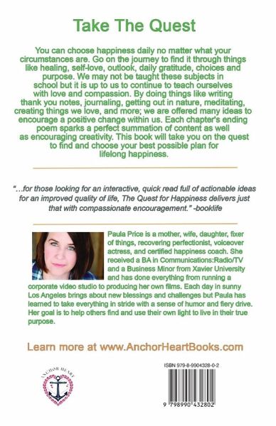 You can choose happiness daily no matter what your circumstances are. Go on the journey to find it through things like healing, self-love, outlook, daily gratitude, choices and purpose. We may not be taught these subjects in school but it is up to us to continue to teach ourselves with love and compassion. By doing things like writing thank you notes, journaling, getting out in nature, meditating, creating things we love, and more; we are offered many ideas to encourage a positive change within us. Each chapter's ending poem sparks a perfect summation of content as well as encouraging creativity. This book will take you on the quest to find and choose your best possible plan for lifelong happiness.