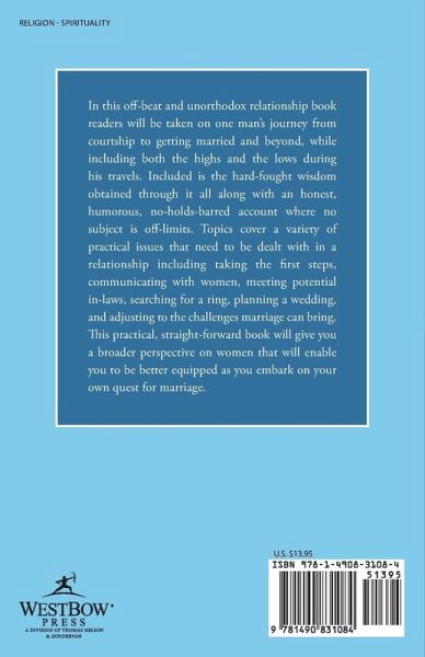 In this off-beat and unorthodox relationship book readers will be taken on one man?s journey from courtship to getting married and beyond, while including both the highs and the lows during his travels. Included is the hard-fought wisdom obtained through it all along with an honest, humorous, no-holds-barred account where no subject is off-limits. Topics cover a variety of practical issues that need to be dealt with in a relationship including taking the first steps, communicating with women, meeting potential in-laws, searching for a ring, planning a wedding, and adjusting to the challenges marriage can bring. This practical, straight-forward book will give you a broader perspective on women that will enable you to be better equipped as you embark on your own quest for marriage.