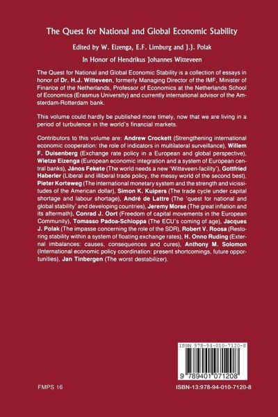 Former students of Dr H. J. Witteveen and many of those who collaborated with him in the past decades have decided a while ago that his great scientific and social merits are ample reason for presenting him with a Liber Amicorum. The fortieth anniversary of his appointment as professor at the Netherlands School of Economics in Rotterdam in the Spring of 1988 seemed a suitable time for presentation. For this purpose a committee was formed consisting of the members listed below. The last three of these also act as editorial committee of this anniversary volume. The topic the editorial committee chose is 'The quest for national and global economic stability'; this topic has always attracted Dr Witteveen's special attention and is in fact the common theme of his publications and speeches. In compiling this volume, the editorial committee tried to give expression to the three fields in which Dr Witt eve en developed his main activities: university, politics and international economic organizations. The committee is deeply grateful to the authors who promised and supplied their contributions with great enthusiasm. All contributions were completed before August 1, 1987.