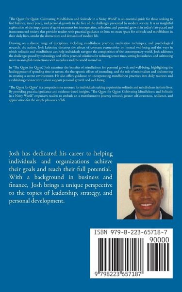 "The Quest for Quiet: Cultivating Mindfulness and Solitude in a Noisy World" is an essential guide for those seeking to find balance, inner peace, and personal growth in the face of the challenges presented by modern society. It is an insightful exploration of the importance of quiet moments for introspection, reflection, and personal growth in today's fast-paced and interconnected society that provides readers with practical guidance on how to create space for solitude and mindfulness in their daily lives, amidst the distractions and demands of modern life. Drawing on a diverse range of disciplines, including mindfulness practices, meditation techniques, and psychological research, the author, Josh Luberisse discusses the effects of constant connectivity on mental well-being and the ways in which solitude and mindfulness can help individuals navigate the complexities of the contemporary world. Josh addresses the challenges posed by technology and offers practical solutions for reducing screen time, setting boundaries, and cultivating more meaningful connections with ourselves and the world around us. In "The Quest for Quiet," Josh examines the benefits of mindfulness for personal growth and well-being, highlighting the healing power of spending time in nature, the therapeutic effects of journaling, and the role of minimalism and decluttering in creating a serene environment. He also offers guidance on incorporating mindfulness practices into daily routines and establishing consistent rituals to support personal growth and well-being. "The Quest for Quiet" is a comprehensive resource for individuals seeking to prioritize solitude and mindfulness in their lives. By providing practical guidance and evidence-based insights, "The Quest for Quiet: Cultivating Mindfulness and Solitude in a Noisy World" empowers readers to embark on a transformative journey towards greater self-awareness, resilience, and appreciation for the simple pleasures of life.