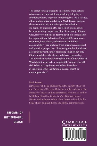The modern world is dominated by complex organizations. In this book Mark Bovens analyzes the questions associated with the search for responsiblity within such organizations. In organizations with many people contributing in many different ways, how can we determine who is accountable for organizational behavior? How do we define responsible behavior within organizations? Can different notions of responsibility prevent abuses? His analysis is multidisciplinary, combining law, social science, ethics, and organizational design, and provides a number of suggestions for institutional reform.
