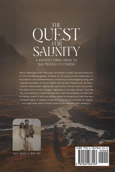 Denny Seabright's tale The Quest for Salinity It hooks you and draws you in from the first paragraph. Whether or not you're an avid fisherman, it's enjoyable to read and reminiscent of listening to and laughing along with a good storyteller. I've known Denny and his wife Theresa over 25 years, and he's always been able to tell a good story-he can write one as well. You don't want to miss this gem, especially if you enjoy fishing. You'll feel like you're sitting on a sun-warmed dock with the prospect of fresh fish for dinner, even if it isn't you fishing. Follow his adventures from the Shenandoah Valley of Virginia, to the Bahamas, Florida and back to Virginia. You might even want to book a fishing trip with him after reading it.