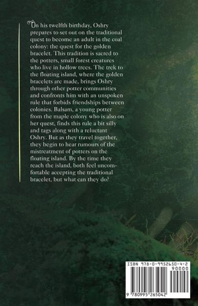 On his twelfth birthday, Oshry prepares to set out on the traditional quest to become an adult in the coal colony: the quest for the golden bracelet. This tradition is sacred to the potters, small forest creatures who live in hollow trees. The trek to the floating island, where the golden bracelets are made, brings Oshry through other potter communities and confronts him with an unspoken rule that forbids friendships between colonies. Balsam, a young potter from the maple colony who is also on her quest, finds this rule a bit silly and tags along with a reluctant Oshry. But as they travel together, they begin to hear rumours of the mistreatment of potters on the floating island. By the time they reach the island, both feel uncomfortable accepting the traditional bracelet, but what can they do?