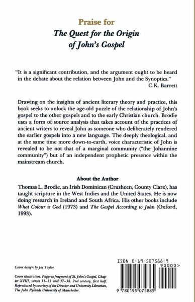 This book presents a controversial thesis concerning the composition of the Gospel According to John. Most New Testament scholars believe that John was independent of the other three (Synoptic) Gospels, although some hold that he may have been familiar with Mark. This has led many to attempt to reconstruct the history of the community within which and for which John must have written. Brodie argues, however, that until the source question is settled, the historical question remains fruitless. What has been missing from Johannine scholarship, he says, is an accurate sense of the way in which writers of the ancient world set about composing their works. Given this literary context, it can be argued that John knew and used not only all of the Synoptic Gospels, but Acts, Ephesians, and the Pentateuch as well. Finally Brodie concludes that `John' was the individual John and not the mouthpiece of a putative `Johannine Community'. The Gospel should thus be read as a unified work, and not as the product of an aggregation of different sources or different dates of redaction.