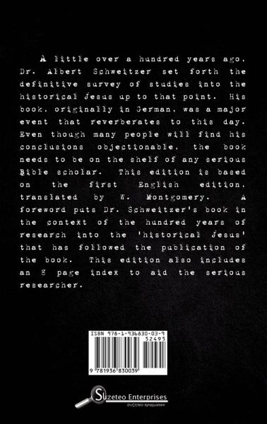 A little over a hundred years ago, Dr. Albert Schweitzer set forth the definitive survey of studies into the historical Jesus up to that point. His book, originally in German, was a major event that reverberates to this day. Even though many people will find his conclusions objectionable, the book needs to be on the shelf of any serious Bible scholar. This edition is based on the first English edition, translated by W. Montgomery. A foreword puts Dr. Schweitzer's book in the context of the hundred years of research into the 'historical Jesus' that has followed the publication of the book. This edition also includes an 8 page index to aid the serious researcher.