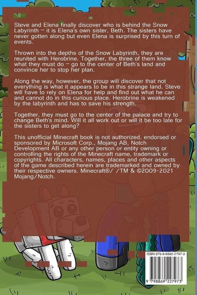 Steve and Elena finally discover who is behind the Snow Labyrinth - it is Elena's own sister, Beth. The sisters have never gotten along but even Elena is surprised by this turn of events. Thrown into the depths of the Snow Labyrinth, they are reunited with Herobrine. Together, the three of them know what they must do - go to the center of Beth's land and convince her to stop her plan. Along the way, however, the group will discover that not everything is what it appears to be in this strange land. Steve will have to rely on Elena for help and find out what he can and cannot do in this curious place. Herobrine is weakened by the labyrinth and has to save his strength. Together, they must go to the center of the palace and try to change Beth's mind. Will it all work out or will it be too late for the sisters to get along? An Unofficial Minecraft Diary Book for Kids Ages 9 - 12 (Preteen / Thrilling Minecraft Adventure / Minecraft Novel This unofficial Minecraft book is not authorized, endorsed or sponsored by Microsoft Corp., Mojang AB, Notch Development AB or any other person or entity owning or controlling the rights of the Minecraft name, trademark or copyrights. All characters, names, places and other aspects of the game described herein are trademarked and owned by their respective owners. Minecraft®/ /TM & (c)2009-2016 Mojang/Notch.