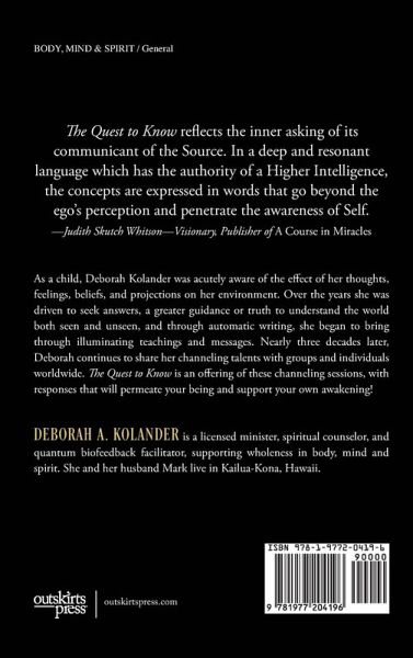"The Quest to Know reflects the inner asking of its communicant of the Source. In a deep and resonant language which has the authority of a Higher Intelligence, the concepts are expressed in words that go beyond the ego’s perception and penetrate the awareness of Self." —Judith Skutch Whitson—Visionary, Publisher of A Course in Miracles As a child, Deborah Kolander was acutely aware of the effect of her thoughts, feelings, beliefs, and projections on her environment. Over the years she was driven to seek answers, a greater guidance or truth to understand the world both seen and unseen, and through automatic writing, she began to bring through illuminating teachings and messages. Nearly three decades later, Deborah continues to share her channeling talents with groups and individuals worldwide. The Quest to Know is an offering of these channeling sessions, with responses that will permeate your being and support your own awakening!