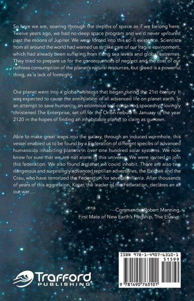 So here we are, soaring through the depths of space as if we belong here. Twelve years ago, we had no deep space program and we'd never ventured past the moons of Jupiter. We were forced into this sci-fi existence. Scientists from all around the world had warned us to take care of our fragile environment, which had already been suffering from rising sea levels and global extremes. They tried to prepare us for the consequences of neglect and the cost of our ruthless consumption of the planet's natural resources, but greed is a powerful thing, as is lack of foresight. Our planet went into a global whiteout that began during the 21st century. It was expected to cause the annihilation of all advanced life on planet earth. In an attempt to save humanity, an enormous self-contained spaceship, lovingly christened The Enterprise, set off for the Orion nebula in January of the year 2120 in the hopes of finding an inhabitable planet to claim as our own. Able to make great leaps into the galaxy, through an induced wormhole, this vessel enabled us to be found by a Federation of different species of advanced humanoids inhabiting planets in over one hundred solar systems. We now know for sure that we are not alone in this universe. We were invited to join this federation. We also found a planet we could inhabit. There are also two dangerous and surprisingly advanced reptilian adversaries, the Palchek and the Crau, who have terrorized the Federation for several millenia. After thousands of years of this aggression, Kotar, the leader of the Federation, declares an all out war.... --Commander Robert Manning, First Mate of New Earth's Flagship, The Elusive.