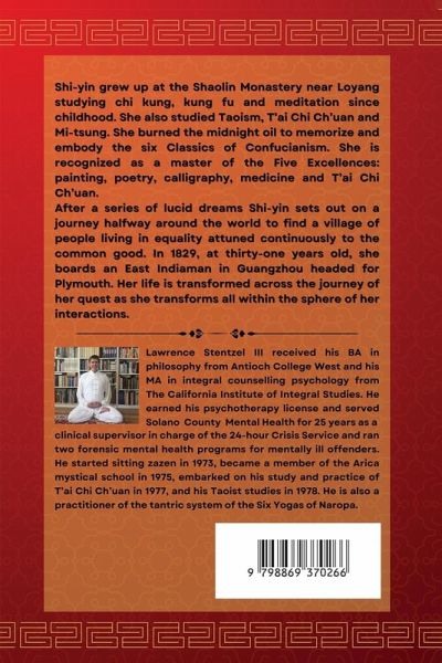 Shi-yin grew up at the Shaolin Monastery near Loyang studying chi kung, kung fu, and meditation since childhood. She also studied Taoism, T'ai Chi Ch'uan and Mi-tsung. She burned the midnight oil to memorize and embody the six Classics of Confucianism. She is recognized as a master of the Five Excellences: painting, poetry, calligraphy, medicine, and T'ai Chi Ch'uan. After a series of lucid dreams, Shi-yin sets out on a journey halfway around the world to find a village of people living in equality attuned continuously to the common good. In 1829, at thirty-one years old, she boards an East Indiaman in Guangzhou headed for Plymouth. Her life is transformed across the journey of her quest as she transforms all within the sphere of her interactions.
