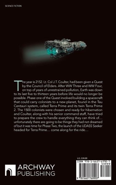 The year is 2152. Lt. Col J.T. Coulter, had been given a Quest by the Council of Elders. After WW Three and WW Four, on top of years of unrestrained pollution, Earth was down to its last five to thirteen years before life would no longer be possible. Phase one of the Quest involved building a spacecraft that could carry colonists to a new planet, found in the Tau Centauri system, called Terra Prime and its twin Terra Prime 2. The 1500 colonists were chosen and ready for hibernation and Coulter, along with his senior command staff, have tried to prepare the crew to handle everything they can think of... unfortunately there are going to be things they had not dreamed of but it was time for Phase Two, the launch of the UDASS Seeker headed for Terra Prime... come along for the ride...