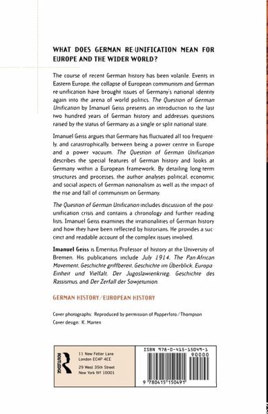 The course of recent German history has been volatile. Events in Eastern Europe, the collapse of European Communism and German Re-Unification has brought issues of Germany's status into the arena of world politics. The Question of German Unification presents an introduction to the last two hundred years of German history and addresses questions raised by the status of Germany as a single or split national state. Imanuel Geiss: * argues that Germany has fluctuated all too frequently, and catastrophically, between being the power centre of Europe or a power vacuum * describes the special features of German history and looks at Germany within a European framework * analyses the political, economic and social aspects of German Nationalism as well as the impact of the collapse of Communism on Germany, through detailing long-term structures and processes * includes discussion of recent political events as well as a chronology and further reading. Imanuel Geiss reflects on the irrationalities of German history, surveys how they have been explained by historians, and provides a succinct and readable account of the complex issues involved.
