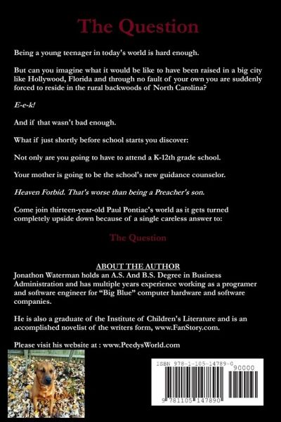 Being a young teenager in today's world is hard enough. But can you imagine what it would be like to have been raised in a big city like Hollywood, Florida and through no fault of your own you are suddenly forced to reside in the rural backwoods of North Carolina? E-e-k! And if that wasn't bad enough. What if just shortly before school starts you discover: Not only are you going to have to attend a K-12th grade school. Your mother is going to be the school's new guidance counselor. Heaven Forbid - That's worse than being a Preacher's son. Come join the non-stop, unpredictable adventures in thirteen-year-old Paul Pontiac's world as it gets turned completely upside down because of a single careless answer to: The Question