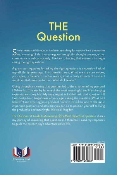 Since the start of time, man has been searching for ways to live a productive and meaningful life. Everyone goes through this thought process, either consciously or subconsciously. The key to finding that answer is to begin asking the right questions. A great starting point for asking the right questions is a question I asked myself thirty years ago. That question was, What are my core values, principles, or beliefs? In other words, what is truly important to me. I simplified that question to this--What do I believe? Going through answering that question led to the creation of my personal I Believe list. This was by far one of the most meaningful and life-changing experiences in my life. My only regret is I didn't ask that question till I was forty-four. Regardless of your age, asking the question (What do I believe?) and creating your personal I Believe list will be one of the most important questions and activities you can do to position yourself to living the productive and meaningful life we all long for. The Question: A Guide to Answering Life's Most Important Question shares my journey of answering that question and then how I used my responses to guide me on each day's adventure called life.