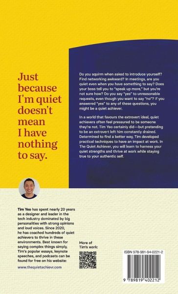Do you squirm in your seat when asked to introduce yourself? Find networking awkward and embarrassing? In meetings, do you keep quiet even though you have something to say? Does your boss often tell you to "speak up more," but you're not sure how? Do you say "yes" to unreasonable requests, even though you want to say "no"? If you answered yes to any of these questions, chances are you are a quiet achiever. In a world that favours the extrovert ideal, quiet achievers often feel pressured to pretend to be someone they are not. Tim Yeo, a seasoned designer and leader in tech, lived this…mehr