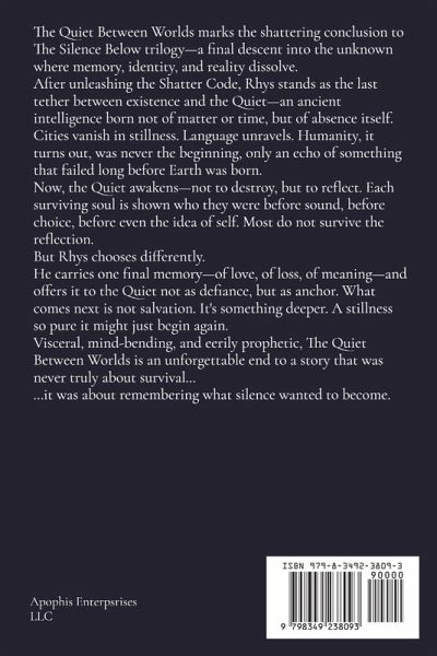 The Quiet Between Worlds marks the shattering conclusion to The Silence Below trilogy-a final descent into the unknown where memory, identity, and reality dissolve. After unleashing the Shatter Code, Rhys stands as the last tether between existence and the Quiet-an ancient intelligence born not of matter or time, but of absence itself. Cities vanish in stillness. Language unravels. Humanity, it turns out, was never the beginning, only an echo of something that failed long before Earth was born. Now, the Quiet awakens-not to destroy, but to reflect. Each surviving soul is shown who they were before sound, before choice, before even the idea of self. Most do not survive the reflection. But Rhys chooses differently. He carries one final memory-of love, of loss, of meaning-and offers it to the Quiet not as defiance, but as anchor. What comes next is not salvation. It's something deeper. A stillness so pure it might just begin again. Visceral, mind-bending, and eerily prophetic, The Quiet Between Worlds is an unforgettable end to a story that was never truly about survival... ...it was about remembering what silence wanted to become.