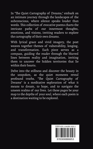 In "The Quiet Cartography of Dreams," embark on an intimate journey through the landscapes of the subconscious, where silence speaks louder than words. This collection of evocative poems charts the intricate paths of our innermost thoughts, emotions, and visions, inviting readers to explore the cartography of their own dreams. With lyrical grace and vivid imagery, the poet weaves together themes of vulnerability, longing, and transformation. Each piece serves as a compass, guiding the reader through the blurred lines between reality and imagination, inviting them to uncover the hidden territories that lie within their hearts. Delve into the stillness and discover the beauty in the unspoken, as the quiet moments reveal profound truths. "The Quiet Cartography of Dreams" is a meditative exploration of what it means to dream, to hope, and to navigate the unseen realms of our lives. Let these pages be your map to the depths of your soul, where each poem is a destination waiting to be explored.