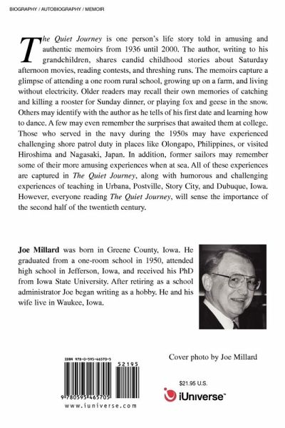 The Quiet Journey is one person's life story told in amusing and authentic memoirs from 1936 until 2000. The author, writing to his grandchildren, shares candid childhood stories about Saturday afternoon movies, reading contests, and threshing runs. The memoirs capture a glimpse of attending a one room rural school, growing up on a farm, and living without electricity. Older readers may recall their own memories of catching and killing a rooster for Sunday dinner, or playing fox and geese in the snow. Others may identify with the author as he tells of his first date and learning how to dance. A few may even remember the surprises that awaited them at college. Those who served in the navy during the 1950s may have experienced challenging shore patrol duty in places like Olongapo, Philippines, or visited Hiroshima and Nagasaki, Japan. In addition, former sailors may remember some of their more amusing experiences when at sea. All of these experiences are captured in The Quiet Journey, along with humorous and challenging experiences of teaching in Urbana, Postville, Story City, and Dubuque, Iowa. However, everyone reading The Quiet Journey, will sense the importance of the second half of the twentieth century.