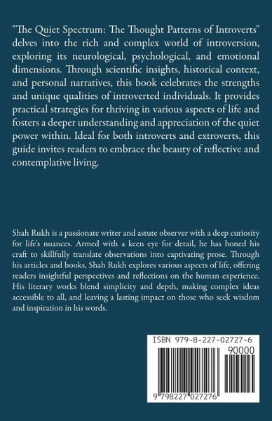 "The Quiet Spectrum: The Thought Patterns of Introverts" delves into the rich and complex world of introversion, exploring its neurological, psychological, and emotional dimensions. Through scientific insights, historical context, and personal narratives, this book celebrates the strengths and unique qualities of introverted individuals. It provides practical strategies for thriving in various aspects of life and fosters a deeper understanding and appreciation of the quiet power within. Ideal for both introverts and extroverts, this guide invites readers to embrace the beauty of reflective and contemplative living.