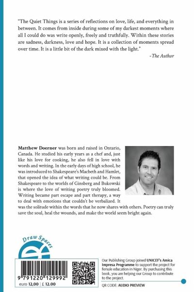 "The Quiet Things is a series of reflections on love, life, and everything in between. It comes from inside during some of my darkest moments where all I could do was write openly, freely and truthfully. Within these stories are sadness, darkness, love and hope. It is a collection of moments spread over time. It is a little bit of the dark mixed with the light." -The Author Matthew Doerner was born and raised in Ontario, Canada. He studied his early years as a chef and, just like his love for cooking, he also fell in love with words and writing. In the early days of high school, he was introduced to Shakespeare's Macbeth and Hamlet, that opened the idea of what writing could be. From Shakespeare to the worlds of Ginsberg and Bukowski is where the love of writing poetry truly bloomed. Writing became part escape and part therapy, a way to deal with emotions that couldn't be verbalized. It was the solitude within the words that he now shares with others. Poetry can truly save the soul, heal the wounds, and make the world seem bright again.