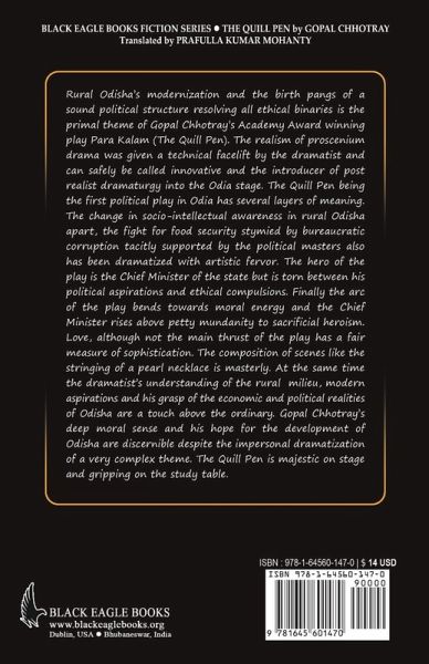 Rural Odisha's modernization and the birth pangs of a sound political structure resolving all ethical binaries is the primal theme of Gopal Chhotray's Academy Award winning play Para Kalam(The Quill Pen). The realism of proscenium drama was given a technical facelift by the dramatist and can safely be called innovative and the introducer of post realist dramaturgy into the Odia stage. The Quill Pen being the first political play in Odia has several layers of meaning. The change in socio-intellectual awareness in rural Odisha apart, the fight for food security stymied by bureaucratic corruption tacitly supported by the political masters also has been dramatized with artistic fervor. The hero of the play is the Chief Minister of the state but is torn between his political aspirations and ethical compulsions. Finally the arc of the play bends towards moral energy and the Chief Minister rises above petty mundanity to sacrificial heroism. Love, although not the main thrust of the play has a fair measure of sophistication. The composition of scenes like the stringing of a pearl necklace is masterly. At the same time the dramatist's understanding of the rural milieu, modern aspirations and his grasp of the economic and political realities of Odisha are a touch above the ordinary. Gopal Chhotray's deep moral sense and his hope for the development of Odisha are discernible despite the impersonal dramatization of a very complex theme. The Quill Pen is majestic on stage and gripping on the study table.