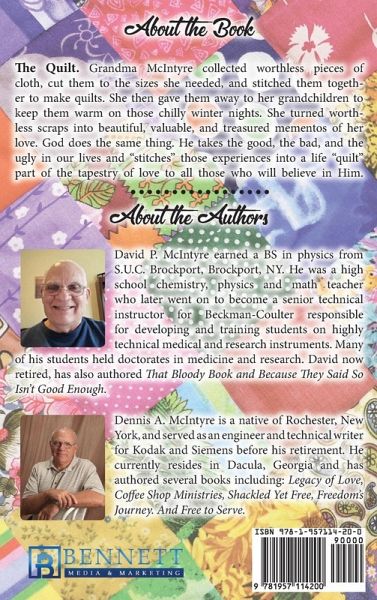 The Quilt. Grandma McIntyre collected worthless pieces of cloth, cut them to the sizes she needed, and stitched them together to make quilts. She then gave them away to her grandchildren to keep them warm on those chilly winter nights. She turned worthless scraps into beautiful, valuable, and treasured mementos of her love. God does the same thing. He takes the good, the bad, and the ugly in our lives and "stitches" those experiences into a life "quilt" part of the tapestry of love to all those who will believe in Him.