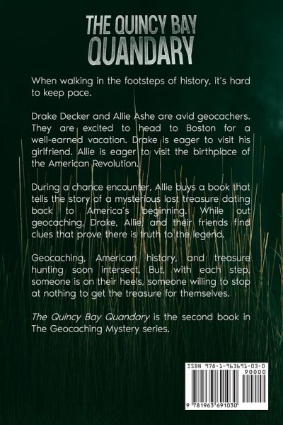 When walking in the footsteps of history, it's hard to keep pace. Drake Decker and Allie Ashe are avid geocachers. They are excited to head to Boston for a well-earned vacation. Drake is eager to visit his girlfriend. Allie is eager to visit the birthplace of the American Revolution. During a chance encounter, Allie buys a book that tells the story of a mysterious lost treasure dating back to America's beginning. While out geocaching, Drake, Allie, and their friends find clues that prove there is truth to the legend. Geocaching, American history, and treasure hunting soon intersect. But, with each step, someone is on their heels, someone willing to stop at nothing to get the treasure for themselves. The Quincy Bay Quandary is the second book in The Geocaching Mystery series.