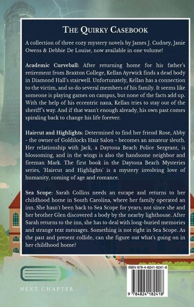 A collection of three cozy mystery novels by James J. Cudney, Janie Owens & Debbie De Louise, now available in one volume! Academic Curveball: After returning home for his father's retirement from Braxton College, Kellan Ayrwick finds a dead body in Diamond Hall's stairwell. Unfortunately, Kellan has a connection to the victim, and so do several members of his family. It seems like someone is playing games on campus, but none of the facts add up. With the help of his eccentric nana, Kellan tries to stay out of the sheriff's way. And if that wasn't enough already, his own past comes spiraling back to change his life forever. Haircut and Highlights: Determined to find her friend Rose, Abby - the owner of Goldilocks Hair Salon - becomes an amateur sleuth. Her relationship with Jack, a Daytona Beach Police Sergeant, is blossoming, and in the wings is also the handsome neighbor and fireman Mark. The first book in the Daytona Beach Mysteries series, 'Haircut and Highlights' is a mystery involving love of humanity, coming of age and romance. Sea Scope: Sarah Collins needs an escape and returns to her childhood home in South Carolina, where her family operated an inn. She hasn't been back to Sea Scope for years; not since she and her brother Glen discovered a body by the nearby lighthouse. After Sarah returns to the inn, she has to deal with long-buried memories and strange text messages. Something is not right in Sea Scope. As the past and present collide, can she figure out what's going on in her childhood home?