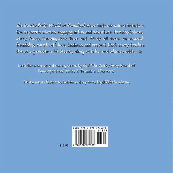 The Quirky Perky World of Hamidopholous finds six animal friends in five separate stories engaging in fun and adventure. Hamidopholous, Jerry, Prissy, Jumping Jack, Jose, and Windy all form an unusual friendship, mixed with love, kindness, and respect. Each story teaches the young reader a life lesson, along with fun and whimsy added in. Look for more up and coming books by Gail: "The Quirky Perky World of Hamidopholous" series 2 "Friends and Farmers" Follow me on facebook, twitter, and my e-mail: rgd15@hotmail.com.