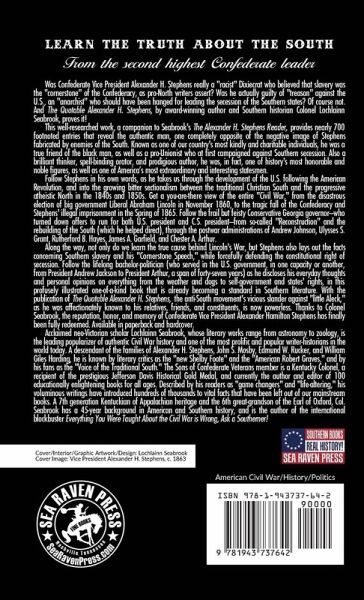 Was Confederate Vice President Alexander H. Stephens really a "racist" Dixiecrat who believed that slavery was the "cornerstone" of the Confederacy, as pro-North writers assert? Was he actually guilty of "treason" against the U.S., an "anarchist" who should have been hanged for leading the secession of the Southern states? Of course not. And The Quotable Alexander H. Stephens: Selections from the Writings and Speeches of the Confederacy's First Vice President, by award-winning Southern historian Colonel Lochlainn Seabrook, proves it! This well-researched work, a companion to Colonel Seabrook's The Alexander H. Stephens Reader, provides nearly 700 footnoted entries that reveal the authentic man, one completely opposite of the negative image of Stephens fabricated by enemies of the South. Known as one of our country's most kindly and charitable individuals, he was a true friend of the black man, as well as a pro-Unionist who at first campaigned against Southern secession. Also a brilliant thinker, spell-binding orator, and prodigious author, he was, in fact, one of history's most honorable and noble figures, as well as one of America's most extraordinary and interesting statesmen. Follow Stephens in his own words, as he takes us through the development of the U.S. after the American Revolution, and into the growing bitter sectionalism between the traditional South and the progressive North in the 1840s and 1850s. Get a you-are-there view of the entire "Civil War," from the disastrous election of big government Liberal Abraham Lincoln in November 1860, to the tragic fall of the Confederacy and Stephens' illegal imprisonment in the Spring of 1865. Follow the frail but feisty Conservative Georgia governor - who turned down offers to run for both U.S. president and C.S. president - from so-called "Reconstruction" and the rebuilding of the South (which he helped direct), through the postwar administrations of Andrew Johnson, Ulysses S. Grant, Rutherford B. Hayes, James A. Garfield, and Chester A. Arthur. Along the way, not only do we learn the true cause behind Lincoln's War, but Stephens also lays out the facts concerning Southern slavery and his "Cornerstone" speech, while forcefully defending the constitutional right of secession. Follow the lifelong bachelor-politician (who served in the U.S. government, in one capacity or another, from President Andrew Jackson to President Arthur, a span of forty-seven years) as he discloses his everyday thoughts and personal opinions on everything from the weather and dogs to self-government and states' rights, in this profusely illustrated one-of-a-kind book that is already becoming a standard in Southern literature. With the publication of The Quotable Alexander H. Stephens, the anti-South movement's vicious slander against "little Aleck," as he was affectionately known to his relatives, friends and constituents, is now powerless. Thanks to Colonel Seabrook, the reputation, honor, and memory of Confederate Vice President Alexander Hamilton Stephens has finally been fully redeemed. Available in paperback and hardcover. Colonel Seabrook's other works include: Abraham Lincoln Was a Liberal, Jefferson Davis Was a Conservative; Lincoln's War: The Real Cause, the Real Winner, the Real Loser; All We Ask is to be Let Alone: The Southern Secession Fact Book; Confederate Monuments: Why Every American Should Honor Confederate Soldiers and Their Memorials; The Unholy Crusade: Lincoln's Legacy of Destruction in the American South; The Great Yankee Coverup: What the North Doesn't Want You to Know About Lincoln's War; Confederacy 101: Amazing Facts You Never Knew About America's Oldest Political Tradition; Everything You Were Taught About American Slavery is Wrong, Ask a Southerner!