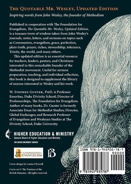 Inspiring words from John Wesley, the founder of Methodism Published in cooperation of The Foundation for Evangelism, The Quotable Mr. Wesley, Updated Edition is a treasure trove of wisdom taken from John Wesley’s journals, notes, letters, and sermons on topics as: Communion, evangelism, grace, perfection, prayer, riches, stewardship, tolerance, Trinity, world, and many others. This updated edition is an essential resource for teachers, leaders, pastors, and Christians interested in this remarkable founder of the Methodist movement. Useful for sermon preparation, teaching, and individual reflection, this book is designed to supplement the library of anyone interested in Wesley and his work.