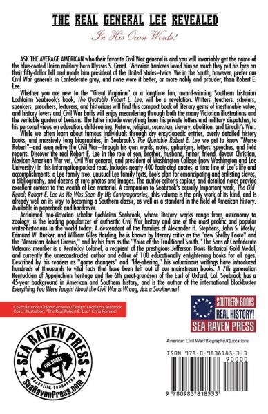 Ask the average American who their favorite Civil War general is and you will invariably get the name of the blue-coated Union military hero Ulysses S. Grant. Victorian Yankees loved him so much they put his face on their fifty-dollar bill and made him president of the United States - twice. We in the South, however, prefer our Civil War generals in Confederate gray, and none wore it better, or more nobly and prouder, than Robert E. Lee. Whether you are new to the "Great Virginian" or a longtime fan, award-winning Southern historian Colonel Lochlainn Seabrook's bestseller, The Quotable Robert E. Lee: Selections From the Writings and Speeches of the South's Most Beloved Civil War General, will be a revelation. Writers, teachers, scholars, speakers, preachers, lecturers, and historians will find this compact book of literary gems of inestimable value, and history lovers and Civil War buffs will enjoy meandering through both the many Victorian illustrations and the veritable garden of Leeisms. The latter include everything from his private letters and military dispatches, to his personal views on education, child-rearing, Nature, religion, secession, slavery, abolition, and Lincoln's War. While we often learn about famous individuals through dry encyclopedic entries, overly detailed history books, and massively long biographies, in Colonel Seabrook's The Quotable Robert E. Lee we get to know "Marse Robert" - and even relive the Civil War - through his own words, notes, aphorisms, letters, speeches, and field reports. Discover the real Robert E. Lee in the role of son, brother, husband, father, friend, devout Christian, Mexican-American War vet, Civil War general, and president of Washington College (now Washington and Lee University) in this information-packed read. Includes nearly 400 footnoted quotes, a time line of Lee's life and accomplishments, a Lee family tree, unusual Lee family facts, Lee's plan for emancipating and enlisting slaves, a bibliography, and dozens of rare photos and images. The author's copious and detailed notes provide excellent context to the wealth of Lee material. A companion to Colonel Seabrook's equally important work, The Old Rebel: Robert E. Lee As He Was Seen By His Contemporaries, The Quotable Robert E. Lee is the only book of its kind, and is well on its way to becoming a Southern classic. This is an attractive, unique, affordable, and popular tourist-friendly work that will appeal to both casual Civil War buffs and hardcore Civil War scholars alike. Available in paperback and hardcover. Acclaimed historian Lochlainn Seabrook, a descendant of the families of Alexander H. Stephens and John S. Mosby, is the most prolific and popular pro-South writer in the world today. Known as the "new Shelby Foote," he is a recipient of the prestigious Jefferson Davis Historical Gold Medal and the author and editor of nearly 100 books, highly educational titles that have introduced hundreds of thousands to the truth about the War for Southern Independence. Colonel Seabrook has a forty-five year background in American and Southern history, and is the author of the international blockbuster Everything You Were Taught About the Civil War is Wrong, Ask a Southerner! His other titles include: Abraham Lincoln Was a Liberal, Jefferson Davis Was a Conservative: The Missing Key to Understanding the American Civil War; The Great Yankee Coverup; Confederacy 101; Slavery 101; Confederate Flag Facts; Everything You Were Taught About American Slavery is Wrong, Ask a Southerner!; Women in Gray: A Tribute to the Ladies Who Supported the Southern Confederacy; The Bittersweet Bond: Race Relations in the Old South as Described by White and Black Southerners; All We Ask is to be Let Alone: The Southern Secession Fact Book; Lincoln's War: The Real Cause, the Real Winner, the Real Loser.