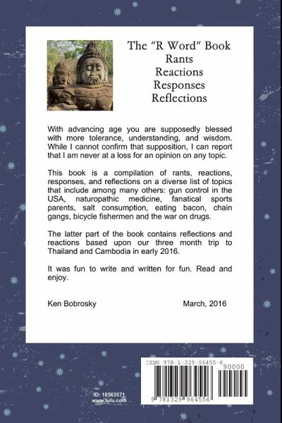 With advancing age you are supposedly blessed with more tolerance, understanding, and wisdom. While I cannot confirm that supposition, I can report that I am never at a loss for an opinion on any topic. This book is a compilation of rants, reactions, responses and reflections on a diverse list of topics. Some of the topics include: gun control in the USA, Naturopathic medicine, modern miracles, salt consumption, eating bacon, bicycle fishermen, chain gangs and the war on drugs. The latter portion of the book contains reactions and reflections based upon our three month visit to Thailand and Cambodia. This section includes reactions and reflections on topics such as the Bamboo Train, Chiang Mai, the killing fields of Cambodia, the flying chicken restaurant, 7-11 stores, washing elephants and a host of other bizarre experiences.